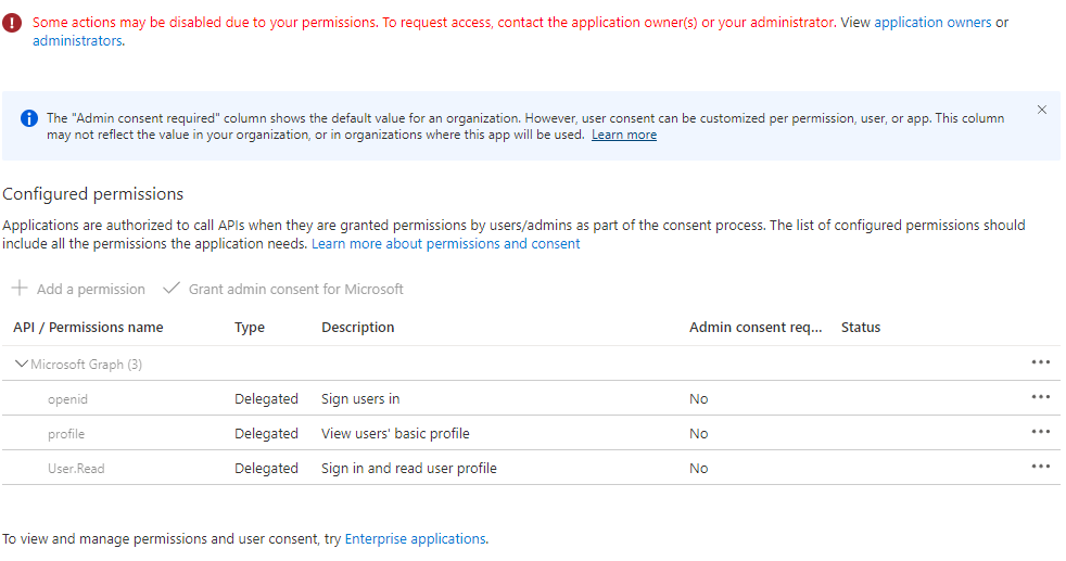 In some cases, Microsoft Entra admin may disable the ability to grant admin consent to Microsoft Entra applications. Here's a screenshot of what this looks like in the Azure portal.
