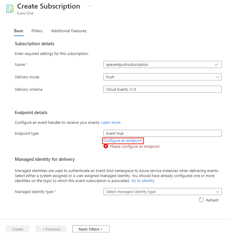 When creating an event subscription with event delivery mode set to Push, you can select Event Hubs as the type of event handler and configure an event hub as a handler.