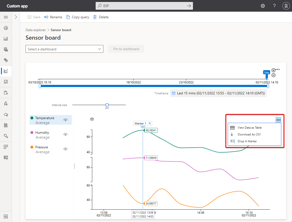 Azure IoT Central provides rich analytics capabilities to analyze historical trends and correlate telemetry from your devices. To get started, select Data explorer on the left pane.