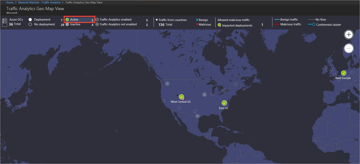 The geo-map shows the top ribbon for selection of parameters such as data centers (Deployed/No-deployment/Active/Inactive/Traffic Analytics Enabled/Traffic Analytics Not Enabled) and countries/regions contributing Benign/Malicious traffic to the active deployment: