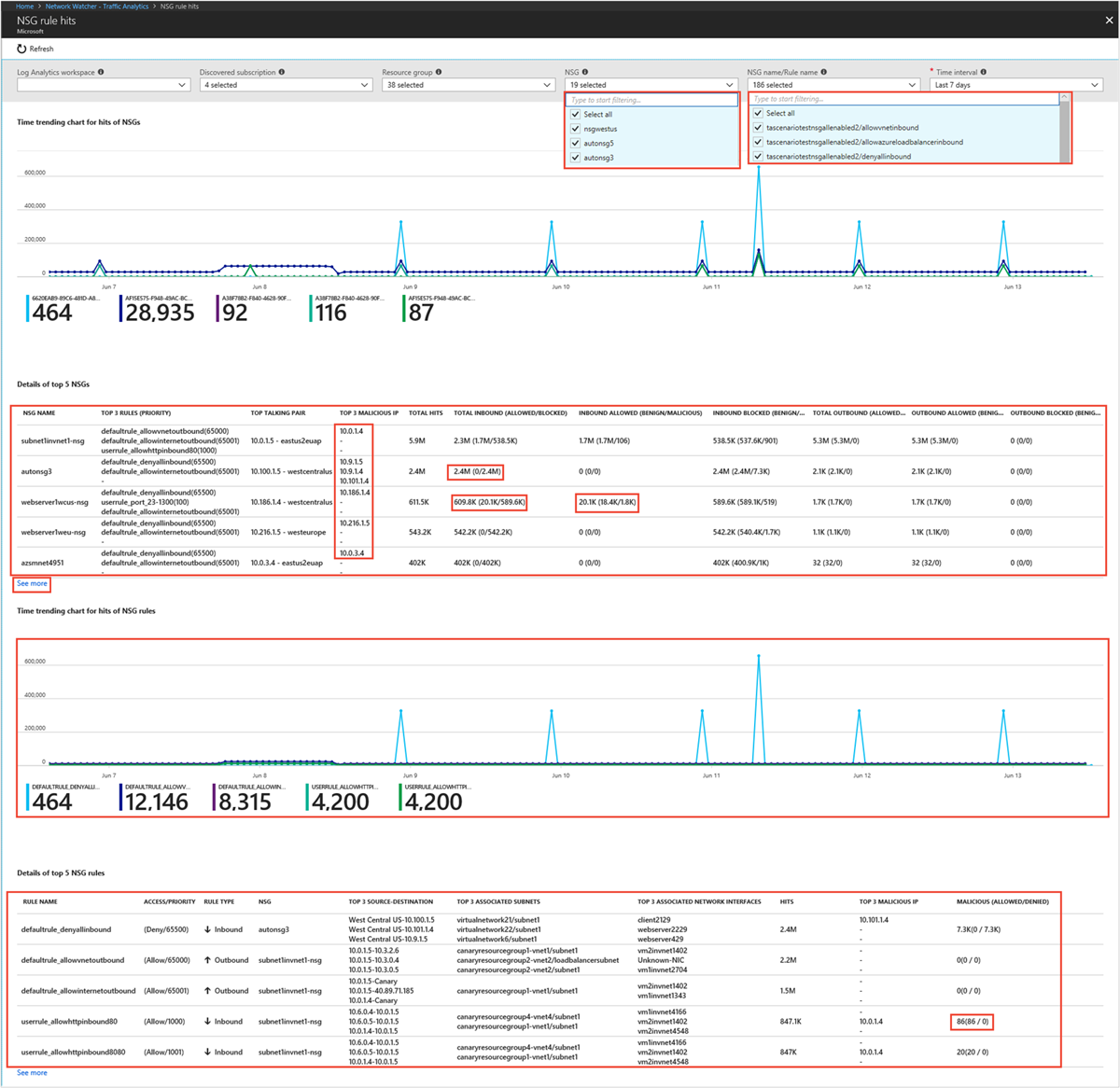 - Which hosts, subnets, virtual networks, and virtual machine scale set are sending or receiving the most traffic, traversing maximum malicious traffic and blocking significant flows?