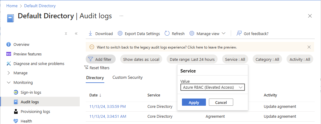 In the Service filter, select Azure RBAC (Elevated Access) and then select Apply.