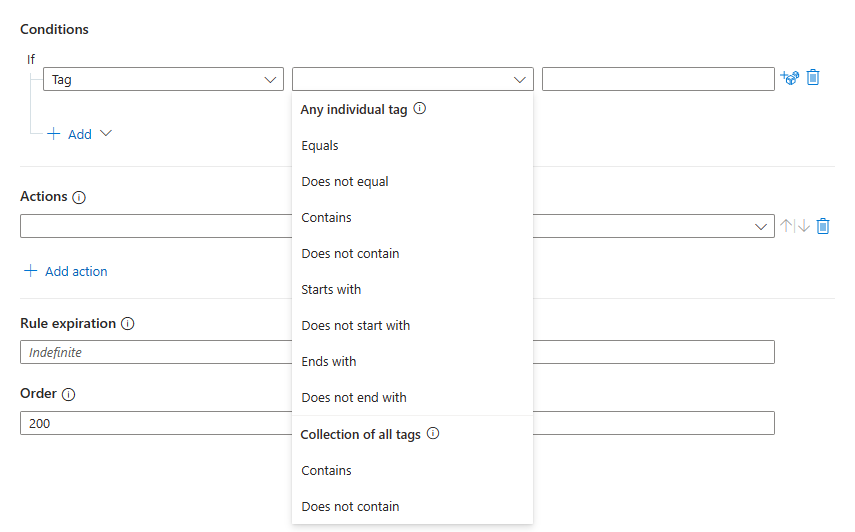 - Conditions with Any individual tag operators evaluate the specified value against every tag in the collection. The evaluation is true when at least one tag satisfies the condition.