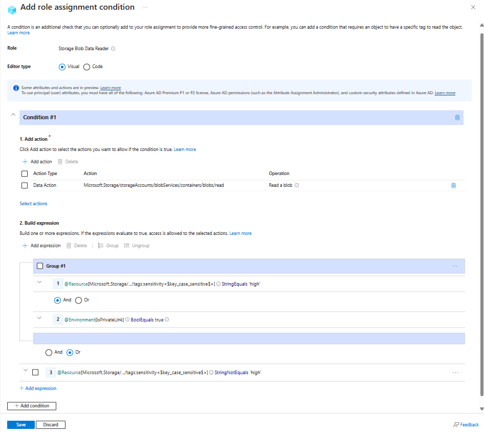 This condition requires that blobs with index tag sensitivity set to high can be read only by users that have a matching value for their sensitivity security attribute. Additionally, they must be accessed over a private endpoint named privateendpoint1. Blobs that have a different value for the sensitivity tag can be accessed over other endpoints or the Internet.