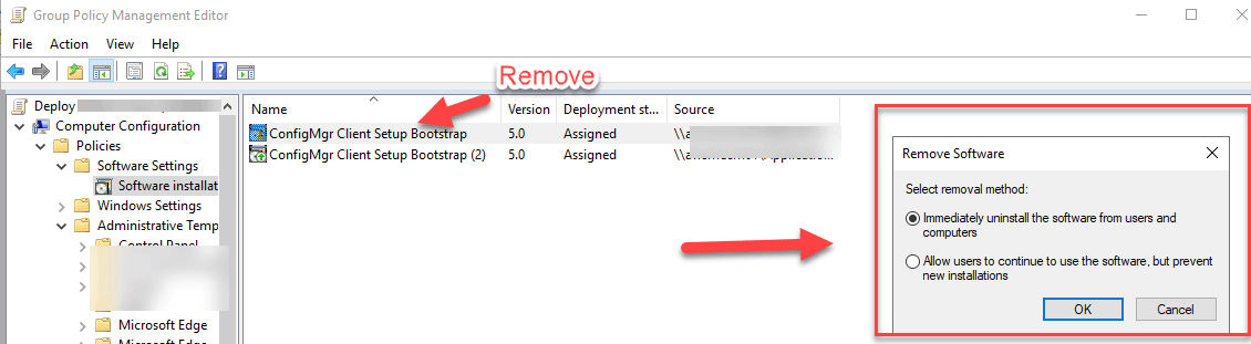 If it is installed ConfigMgr Client Setup Bootstrap (2) on domain client machine, I think it uninstall ConfigMgr Client Setup Bootstrap after you remove this first entry in the screenshot above. But to be on the safe side, I recommend you go for the second option “Allow users to continue to use the software but prevent new installations” below.