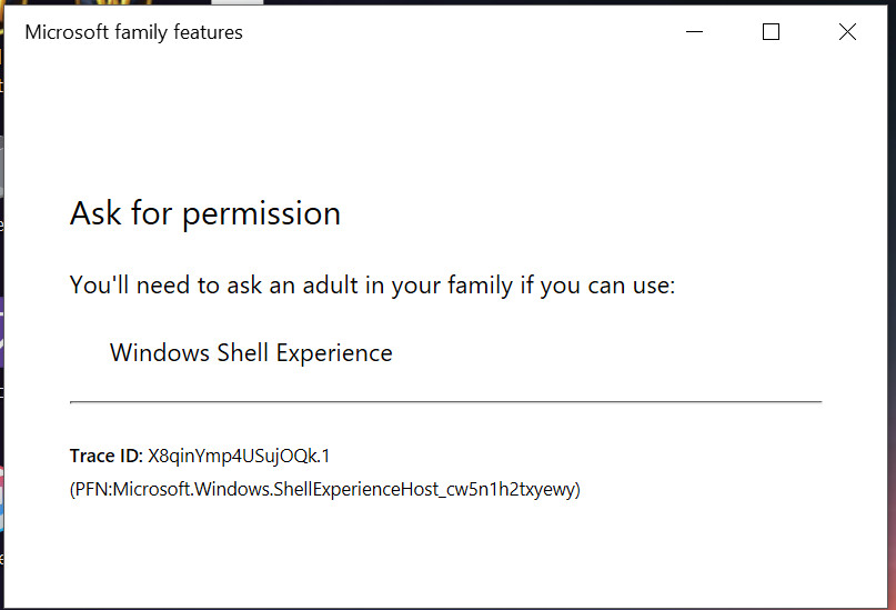 When I log in, a window opens on my desktop with "Microsoft family features" in the heading, telling me to ask for permission to use "Windows Shell Experience". My account is the adult account in my family and there should not be any Microsoft family restrictions on my account. Why am I getting this window?