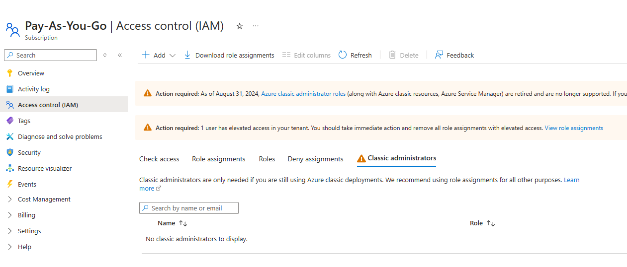 Please note that regarding the First Action Required statement which is attached below, it is a general Warning statement which is shown in all the Microsoft Entra tenants as a Precautionary measure that As of August 31, 2024, Azure classic administrator roles (along with Azure classic resources, Azure Service Manager) are retired and are no longer supported.