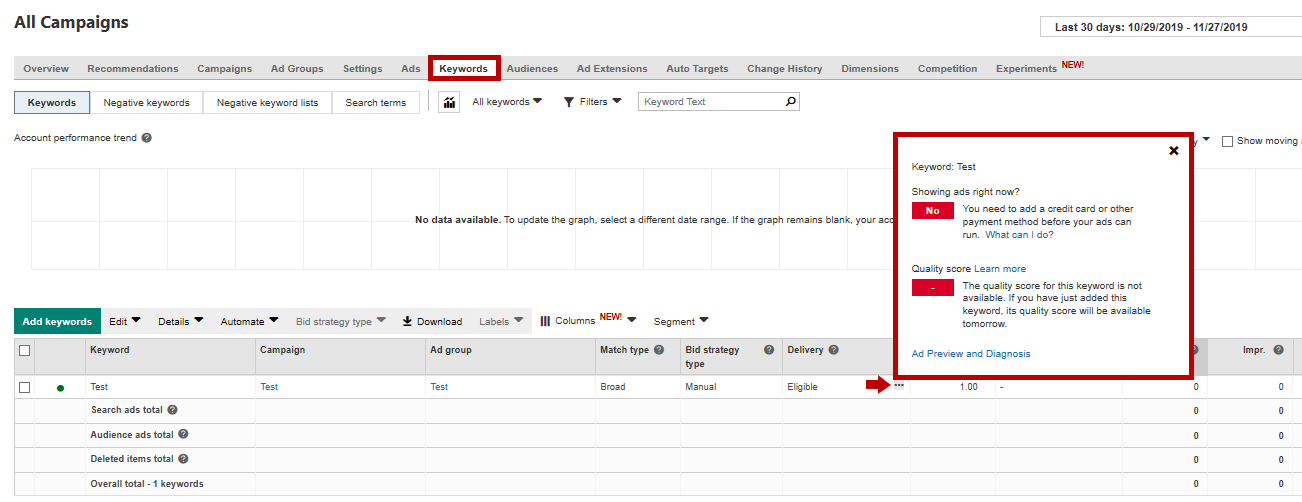 Additionally, you mentioned that your bids are set to the minimum requirement and that your daily budget may be low. This may be the largest issue causing your ads to be ineligible to serve. It is very important to bid competitively to show our system that you want to be displayed with or above your competitors (if your bids and budget are too low, you will not display at all). Best practice for bidding is usually around a one dollar bid; however, it really depends on your business/product/service market. I recommend trying out different bids and monitoring the difference they make. Please note, what you bid is not what the pay-per-click amount is and the pay-per-click is usually always much lower than the set bid.