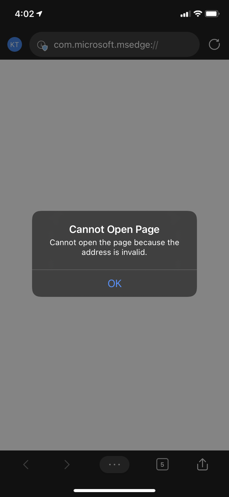 com.microsoft.msedge:// is not a valid website address. I tried it on my Windows computer and also on my Iphone (Installed Edge from the Appstore). Mine displays fine. I tried to check for settings in Edge for IOS to see if we can change the default homepage but it doesn't seem to be available. You can still use Edge if you type the website address manually from the address bar but it will always come up with the invalid address when you launch it.