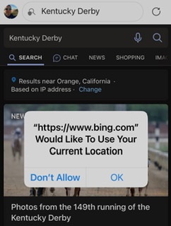 I installed the Bing APP and then I did a search at the top of EDGE on the same subject "Kentucky Derby". This time it didn't ask my permission to use my Current Location. Both of these times, it did show my Current Location at the top of the results, but this time it didn't have that box asking me to use my Current Location.