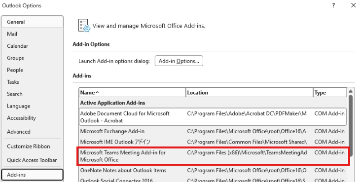 - Please go to Outlook client and go to Files > Options > Add-ins and check whether the meeting add-in is under the Active Application Add-ins list like in below screenshot.