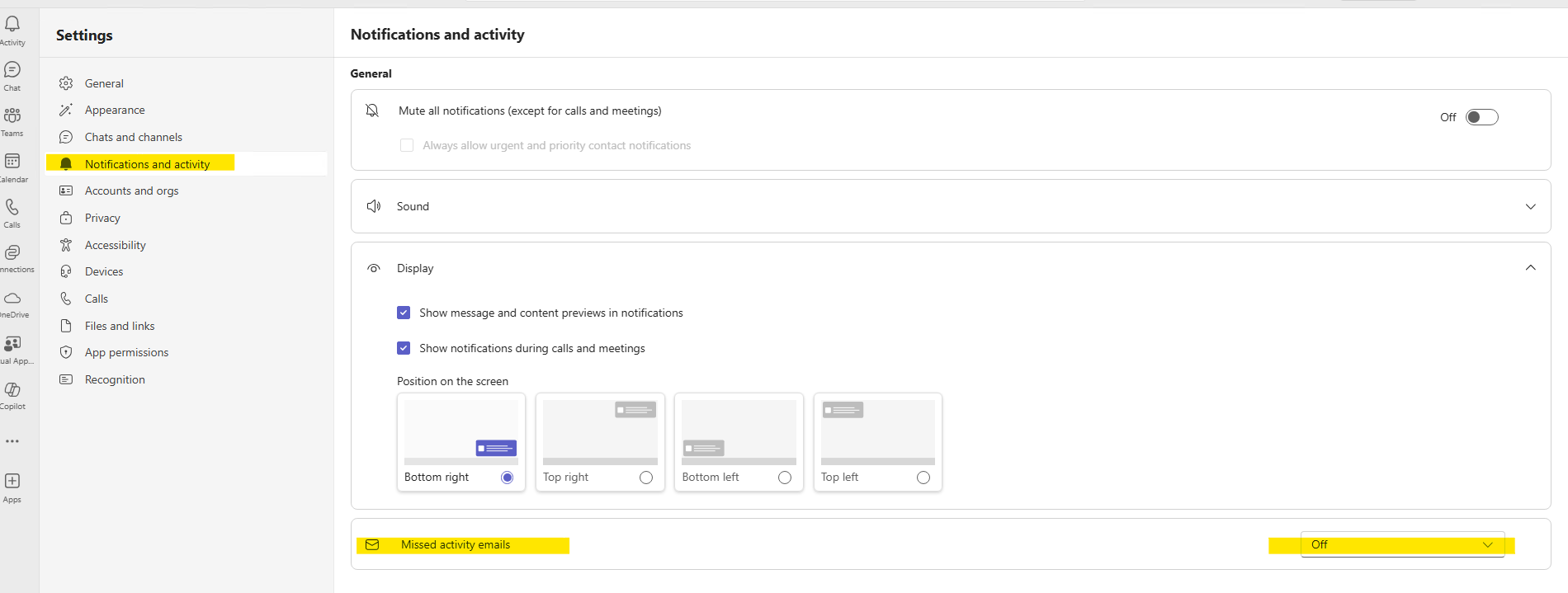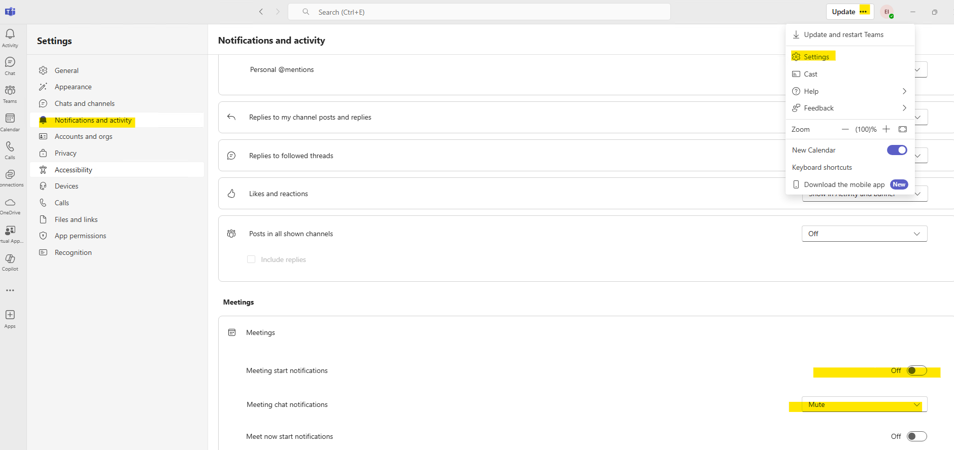 - May I double confirm that you get same situation when you turn off meeting started notification(Off) and meeting chat notifications(Mute)? To check this, click on Three dot (next to your notification icon on the right top corner) -- > Settings > Notifications and Activity option, then select “Off” next to Missed activity emails row,