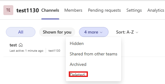 - In the Channels tab, expand the drop-down menu like in below screenshot and select Deleted.