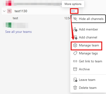 - Navigate to and hover on the teams which the deleted channel belonged to, click More options (three dots) > Manage team.