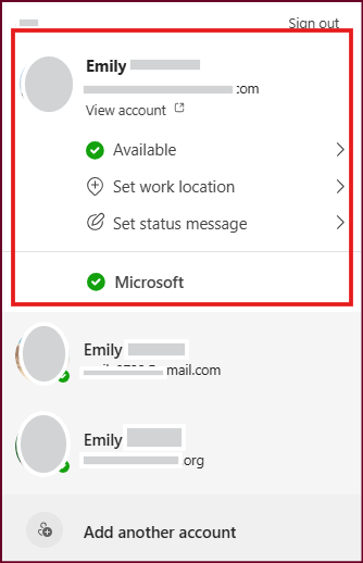 I am sharing an example from my set up here. I have three accounts set up in my Teams. One of the accounts was invited to be a guest user in the Microsoft domain. As you can see, it is my first account, with "Microsoft" listed as a tenant I could switch to under my first account. If I go to my second account or my third account online, I would not find the "Microsoft" organization.