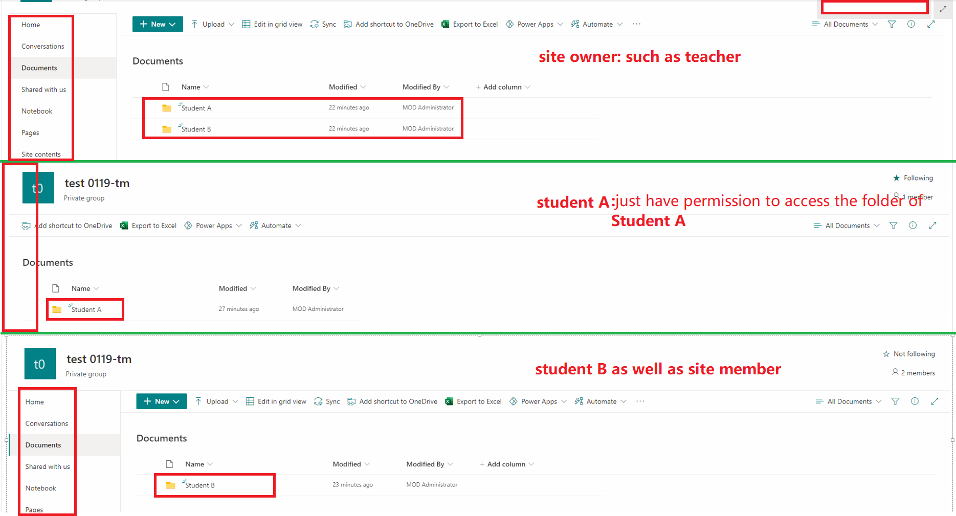 Student A isn’t the site member, but he can see the folder Student A within the library. That because the site owner manages to access the folder Student B within the library to him.