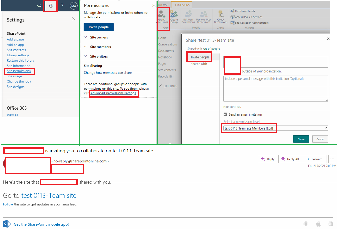 Click the Settings > Site permissions > Advanced permissions settings > Grant Permissions > Invite people > Enter the email > Share.