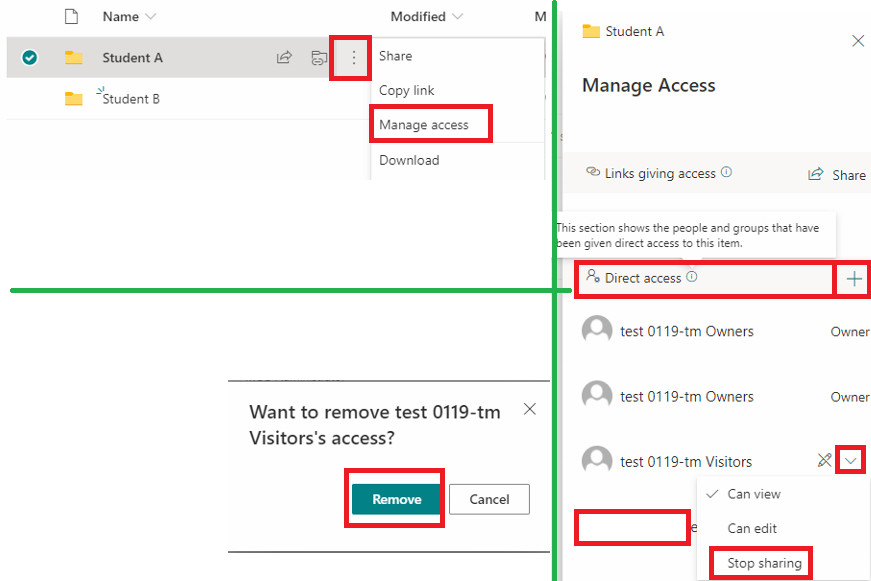 Click Student A > ellipses > Manage access > click drop arrow next test 0119-tm Visitors > Stop sharing > Remove > click “+” next to Direct access > Enter a name or email to grant access to the folder Student A to student A. > Grant access. And then student A can access the folder through the library URL.