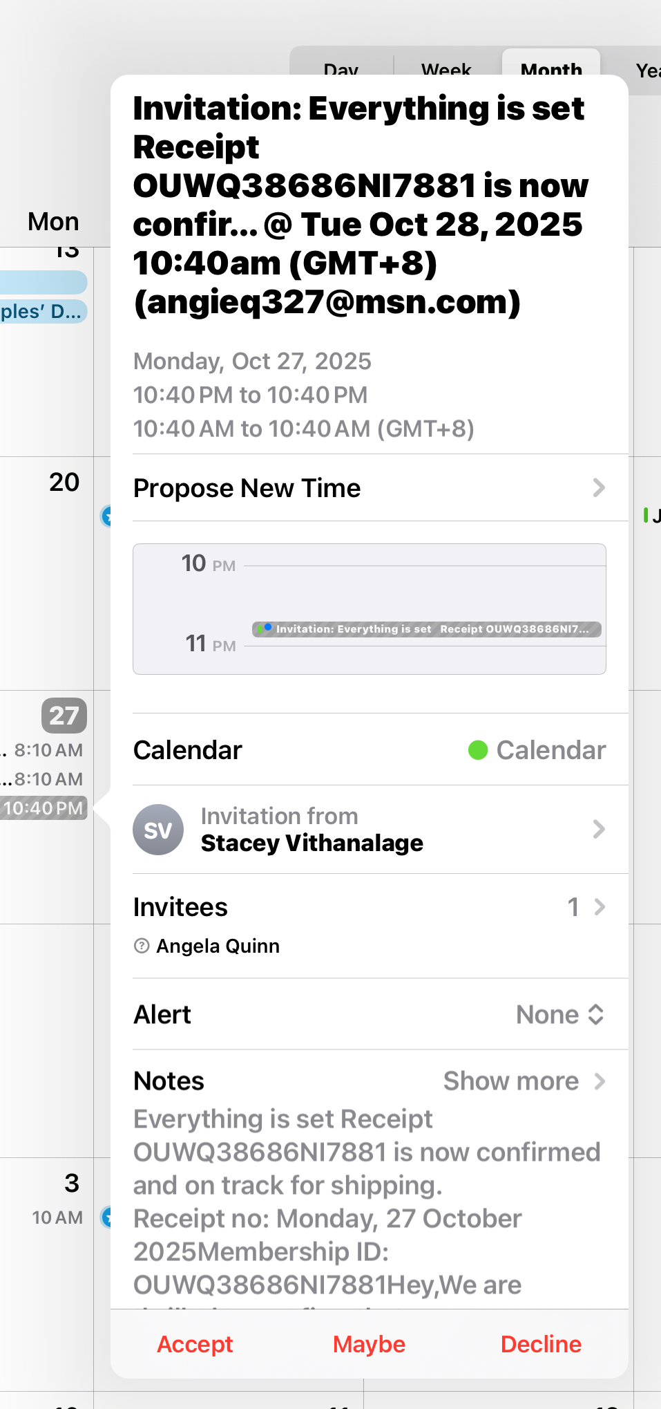 Open the name where it says the invitation is coming from “Stacey Vithanalage” then copy their email address and add them to your blocklist.