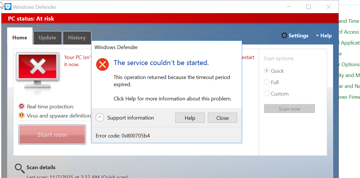 - Temporarily disable Windows Defender and retry the update, as Defender startup failure may be blocking update components.