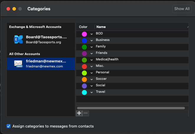 It appears that you are experiencing an issue with assigning categories to email addresses in Outlook for Mac. Based on the information provided, the ability to assign color categories is not available for IMAP email accounts in Outlook 2016 and later versions. If your email account is showing as an IMAP account in the Categories section, it may be due to a misconfiguration or a limitation of the software.