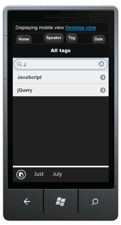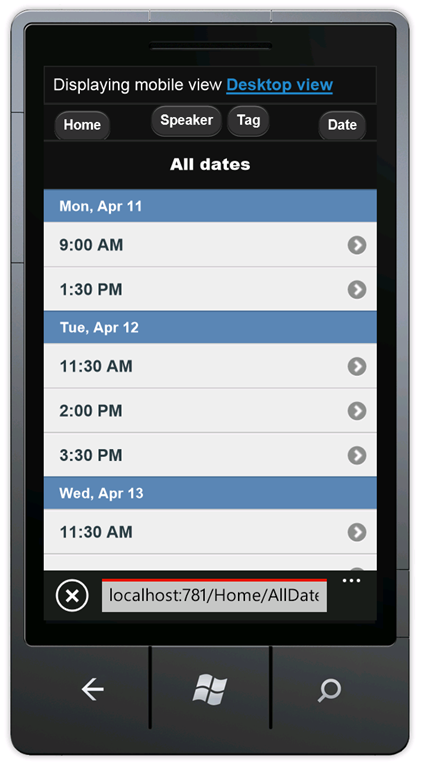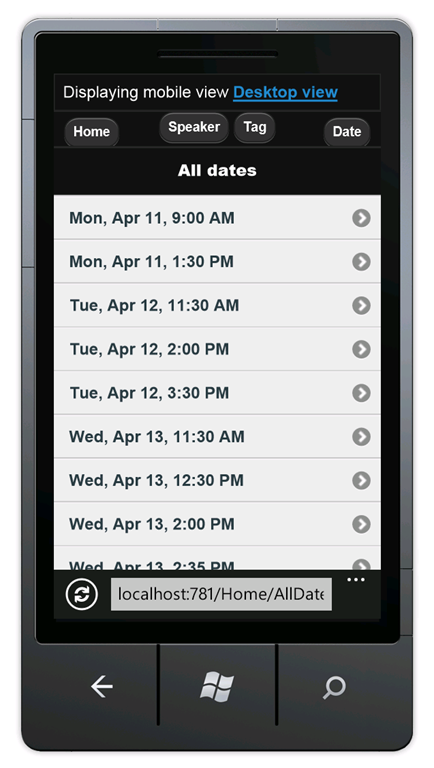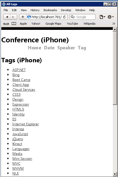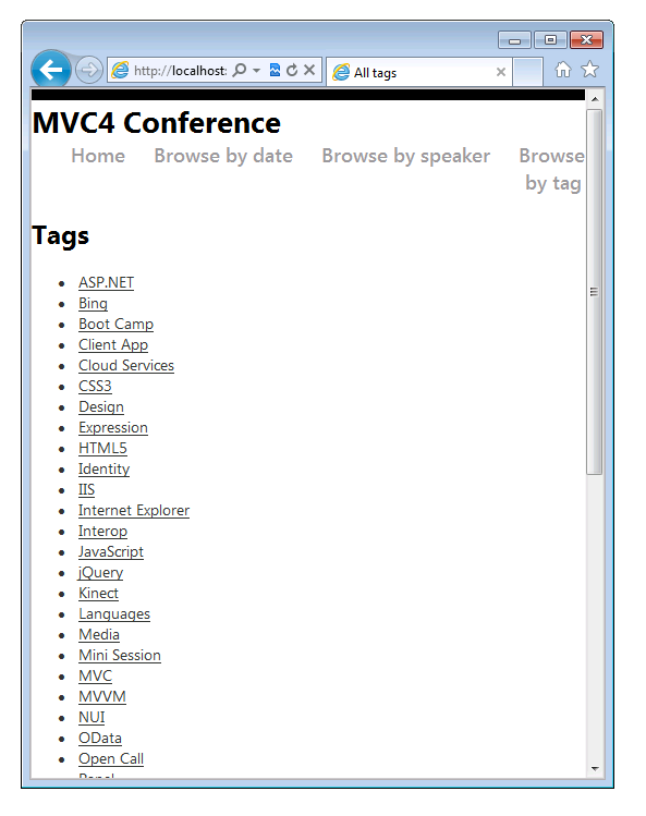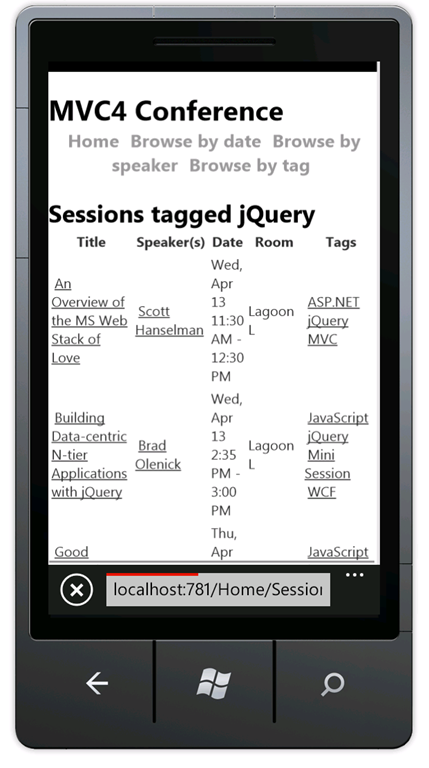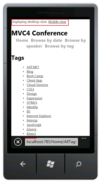 Press CTRL+F5 to run the application, which will display it in your desktop browser. Start your mobile browser emulator, copy the URL for the conference application into the emulator, and then click the Browse by tag link. If you are using the Windows Phone Emulator, click in the URL bar and press the Pause key to get keyboard access. The image below shows the AllTags view (from choosing Browse by tag).