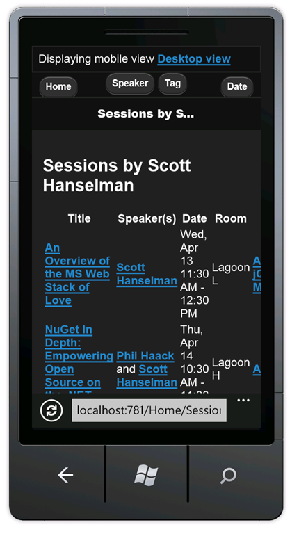 As you can see, the display is difficult to read on a mobile browser. The date column is hard to read and the tags column is out of the view. To fix this, copy Views\Home\SessionsTable.cshtml to Views\Home\SessionsTable.Mobile.cshtml, and then replace the contents of the file with the following code: