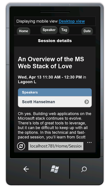 In the mobile browser, select the Speakers link. Because there's no mobile view(AllSpeakers.Mobile.cshtml), the default speakers display (AllSpeakers.cshtml) is rendered using the mobile layout view (_Layout.Mobile.cshtml).