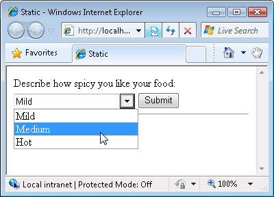We'll use the ComboBox control to display a static list of choices. The user can select a particular level of spiciness for their food from a list of three choices: Mild, Medium, and Hot (see Figure 2).