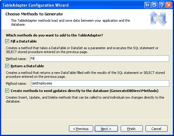 The final step prompts us to name the TableAdapter s methods. Use Fill and GetEmployees as the method names. Also be sure to leave the Create methods to send updates directly to the database (GenerateDBDirectMethods) checkbox checked.