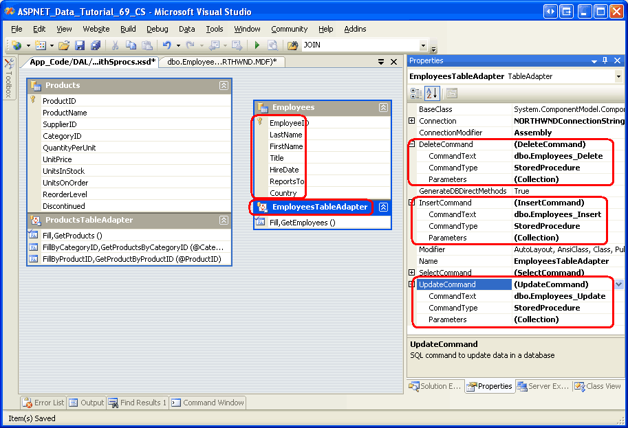 After completing the wizard, take a moment to examine the stored procedures in the database. You should see four new ones: Employees_Select, Employees_Insert, Employees_Update, and Employees_Delete. Next, inspect the EmployeesDataTable and EmployeesTableAdapter just created. The DataTable contains a column for each field returned by the main query. Click on the TableAdapter and then go to the Properties window. There you will see that the InsertCommand, UpdateCommand, and DeleteCommand properties are correctly configured to call the corresponding stored procedures.