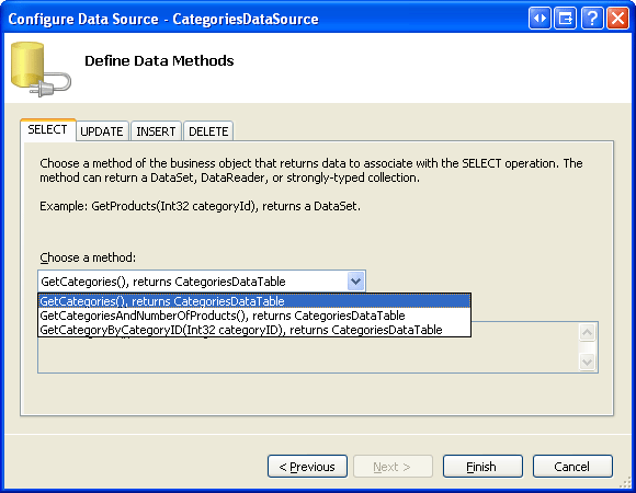 Configure the ObjectDataSource to Use the CategoriesBLL Class s GetCategories() Method