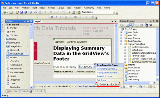 At this point we have a DropDownList (Categories) that lists the categories in the system. We now need to add a GridView that lists those products that belong to the selected category. Before we do, though, take a moment to check the Enable AutoPostBack checkbox in the DropDownList's smart tag. As discussed in the Master/Detail Filtering With a DropDownList tutorial, by setting the DropDownList's AutoPostBack property to true the page will be posted back each time the DropDownList value is changed. This will cause the GridView to be refreshed, showing those products for the newly selected category. If the AutoPostBack property is set to false (the default), changing the category won't cause a postback and therefore won't update the listed products.