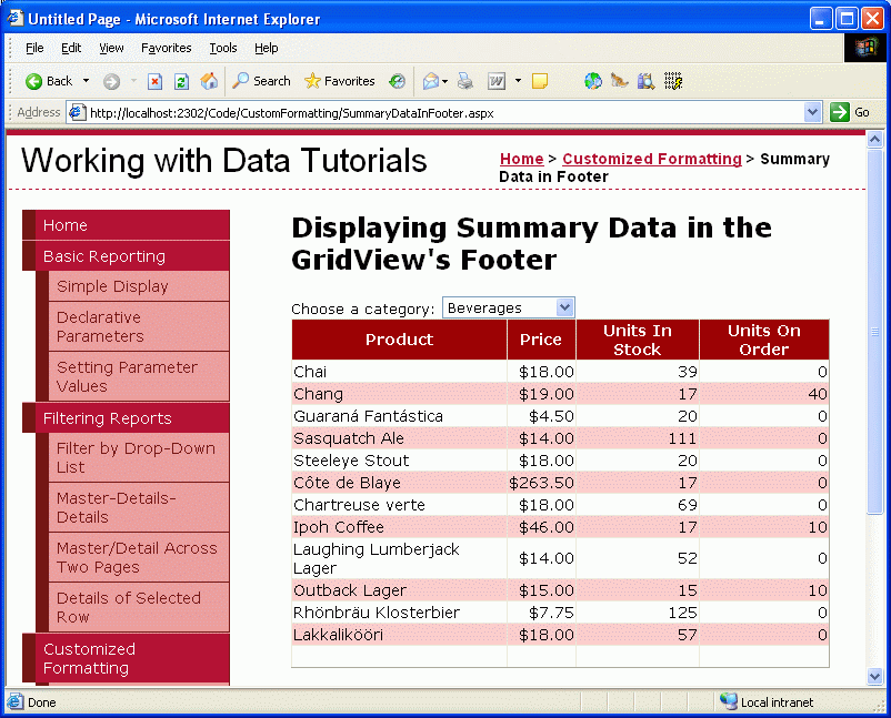 In this tutorial we'll see how to overcome these challenges. Specifically, we'll create a page that lists the categories in a drop-down list with the selected category's products displayed in a GridView. The GridView will include a footer row that shows the average price and total number of units in stock and on order for products in that category.