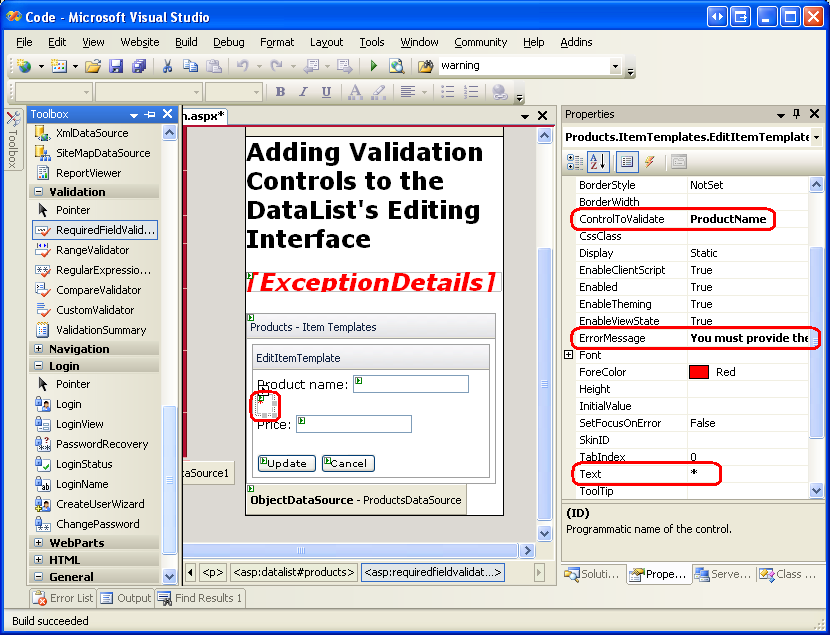 Let s start by adding the necessary validation controls to the DataList s EditItemTemplate. This task can be performed through the Designer by clicking on the Edit Templates link from the DataList s smart tag, or through the declarative syntax. Let s step through the process using the Edit Templates option from the Design view. After choosing to edit the DataList s EditItemTemplate, add a RequiredFieldValidator by dragging it from the Toolbox into the template editing interface, placing it after the ProductName TextBox.