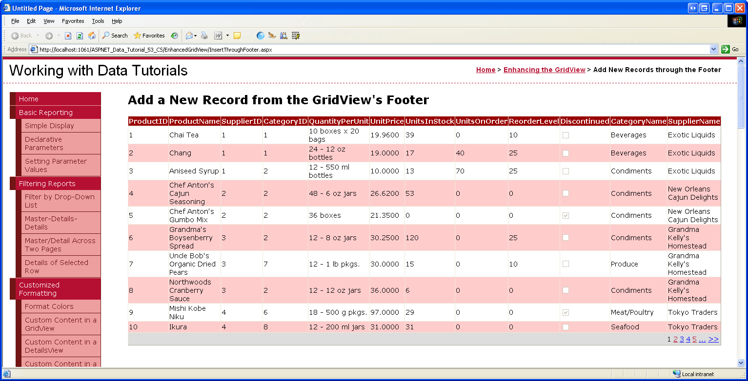 When viewed through a browser, the GridView s footer row now includes the completed inserting interface (see Figure 10). At this point, the inserting interface doesn t include a means for the user to indicate that she s entered the data for the new product and wants to insert a new record into the database. Also, we ve yet to address how the data entered into the footer will translate into a new record in the Products database. In Step 4 we'll look at how to include an Add button to the inserting interface and how to execute code on postback when it s clicked. Step 5 shows how to insert a new record using the data from the footer.