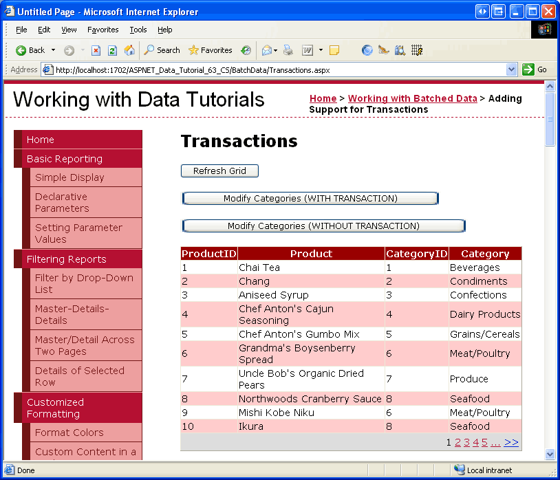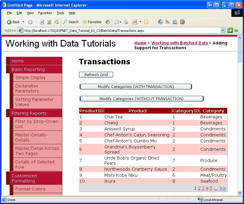 Now try clicking the Modify Categories (WITHOUT TRANSACTION) button. This will result in the same foreign key constraint violation error (see Figure 9), but this time those products whose CategoryID values were changed to a legal value will not be rolled back. Hit your browser s Back button and then the Refresh Grid button. As Figure 10 shows, the CategoryID s of the first eight products have been reassigned. For example, in Figure 8, Chang had a CategoryID of 1, but in Figure 10 it s been reassigned to 2.