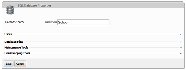 Name the database "School" and click Save. (The page automatically adds the prefix "contosou", so the effective name will be "contosouSchool".)