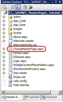 Let's create a web page that allows the user to choose which master page to use - Site.master or Alternate.master - and save this choice in a Session variable. Start by creating a new web page in the root directory named ChooseMasterPage.aspx. When creating this page (or any other content pages henceforth) you don't need to bind it to a master page because the master page is set programmatically in BasePage. However, if you do not bind the new page to a master page then the new page's default declarative markup contains a Web Form and other content supplied by the master page. You'll need to manually replace this markup with the appropriate Content controls. For that reason, I find it easier to bind the new ASP.NET page to a master page.