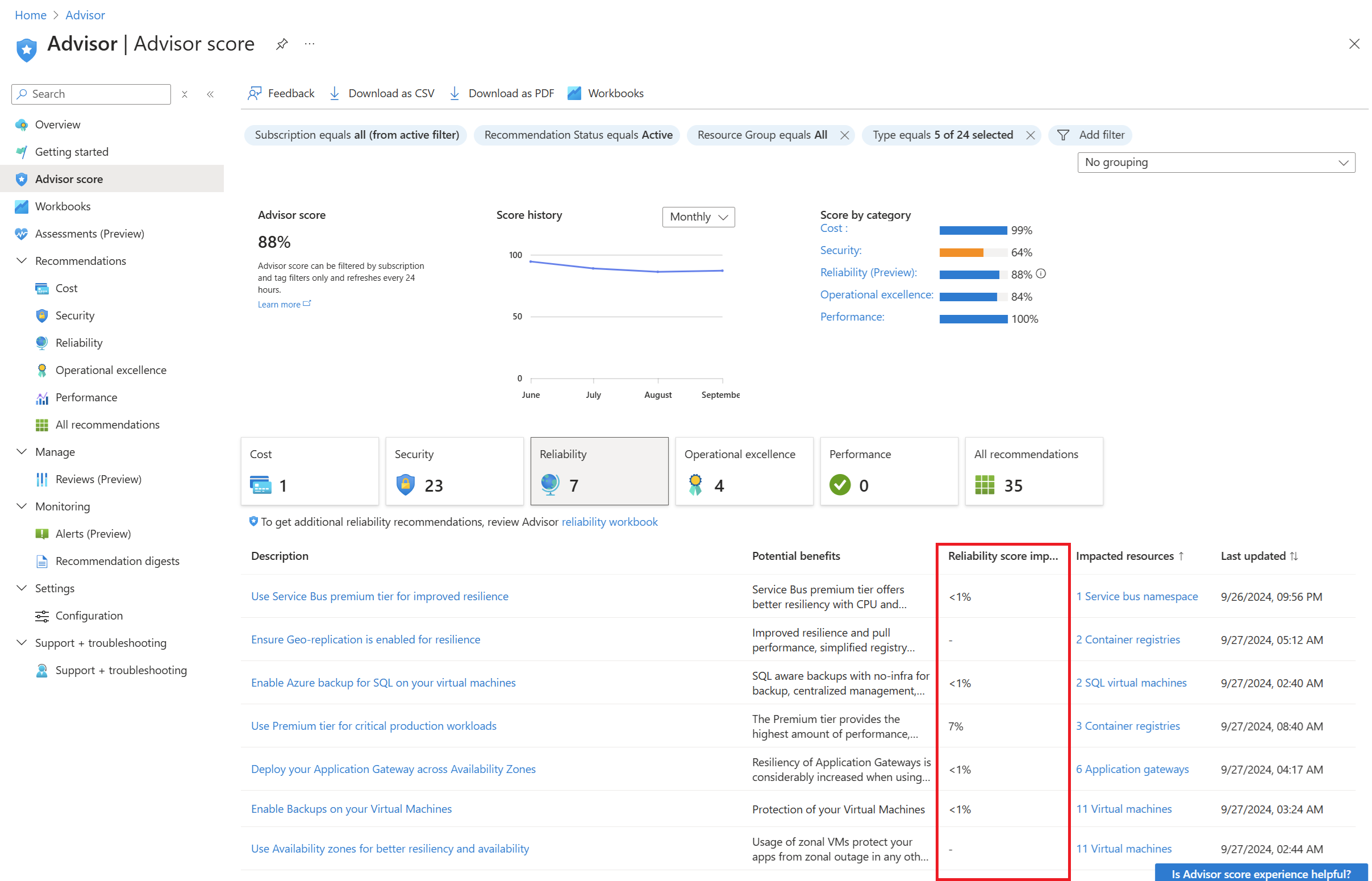 The contribution of each recommendation to your category score is shown clearly on the Advisor score page in the Azure portal. Increase each category score by the percentage point listed in the Potential score increase column. The Potential score increase column value reflects both the weight of the recommendation within the category and the predicted ease of implementation to address the potentially easiest tasks. To help you make the most progress for your time, focus on the recommendations with the greatest effect on the score.