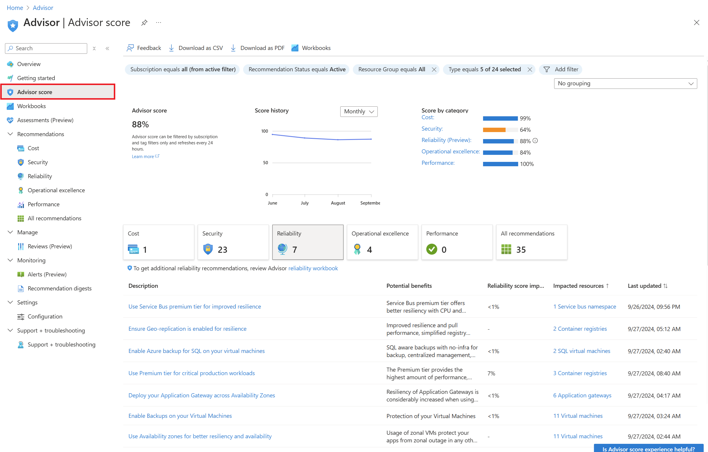 Advisor score helps you baseline how your workload or subscriptions are doing based on an Advisor score. To understand your trend, review the historical trends.