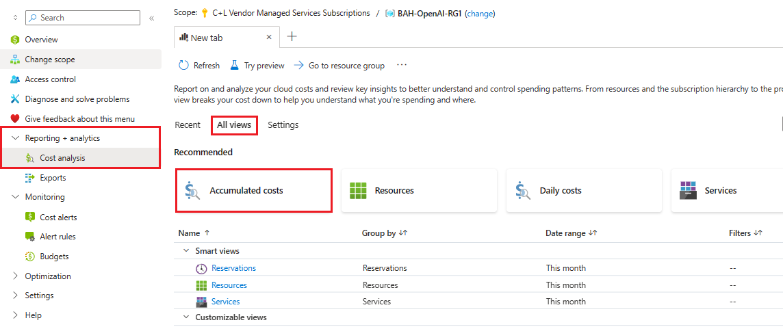 Here's an example of how to use the Cost analysis tool to see your accumulated costs for a subscription or resource group: