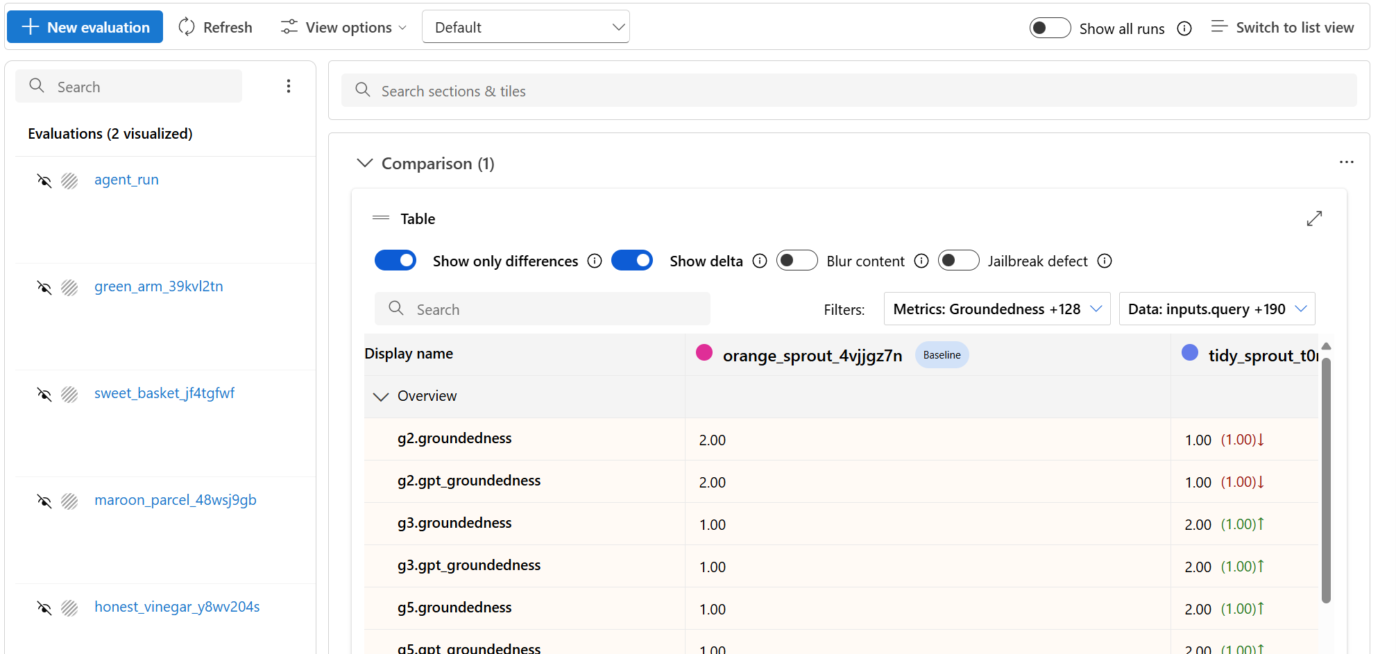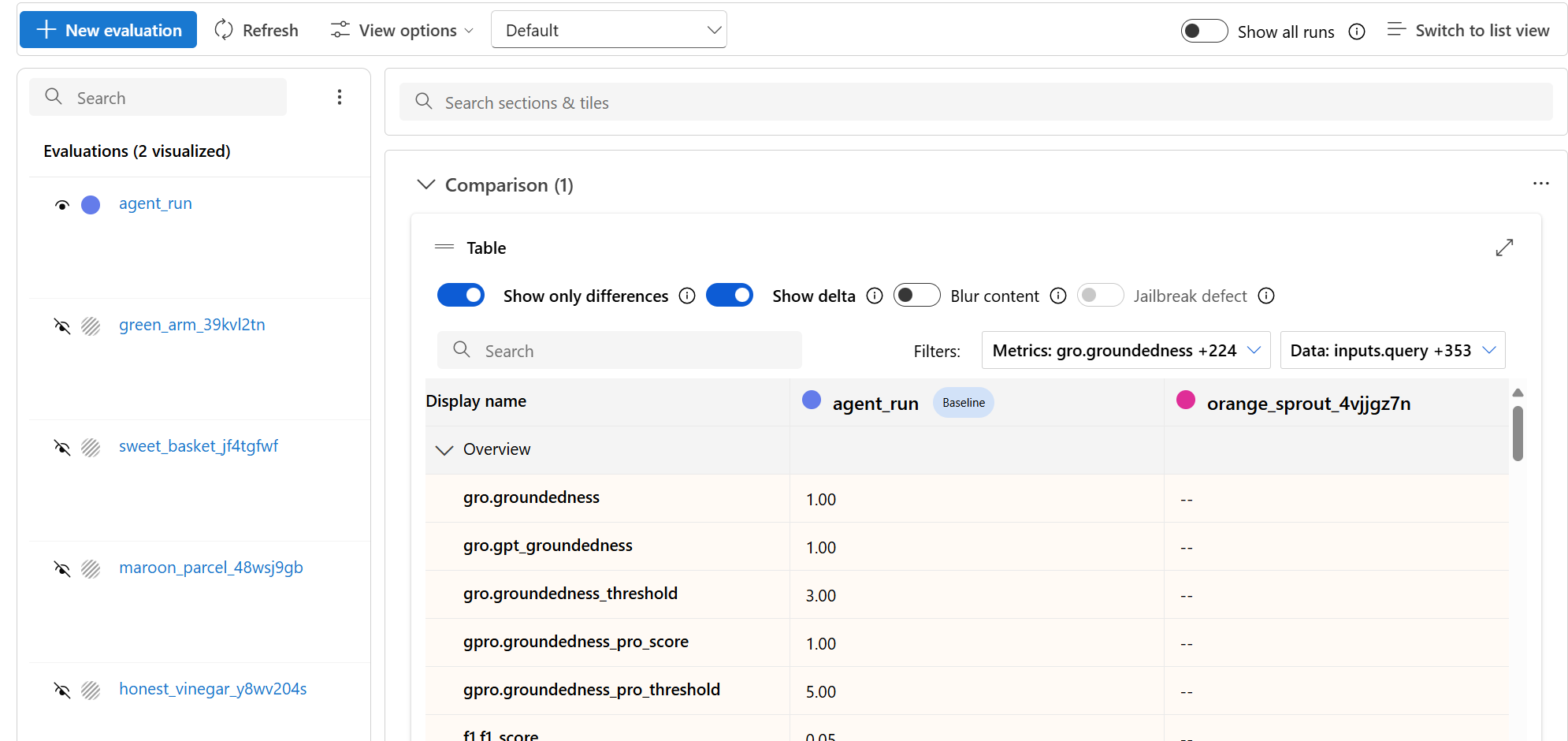 - Numerical value assessment: Enabling the Show delta option helps you understand the extent of the differences between the baseline and other runs. This information can help you evaluate how various runs perform in terms of specific evaluation metrics.