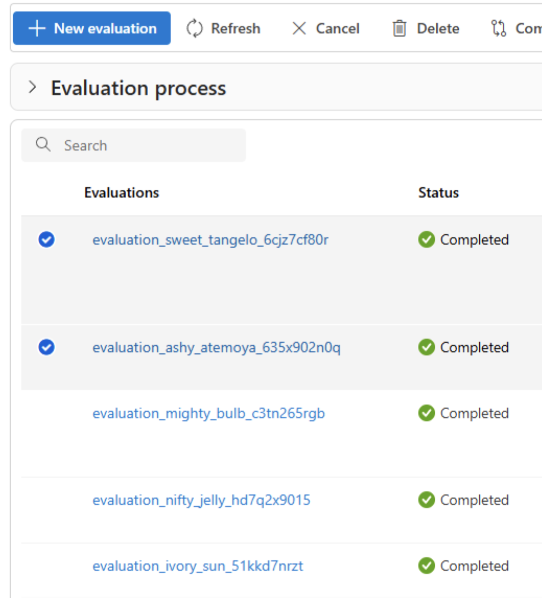 By default, older evaluation runs have matching rows between columns. However, newly run evaluations have to be intentionally configured to have matching columns during evaluation creation. Ensure that the same name is used as the Criteria Name value across all evaluations that you want to compare.