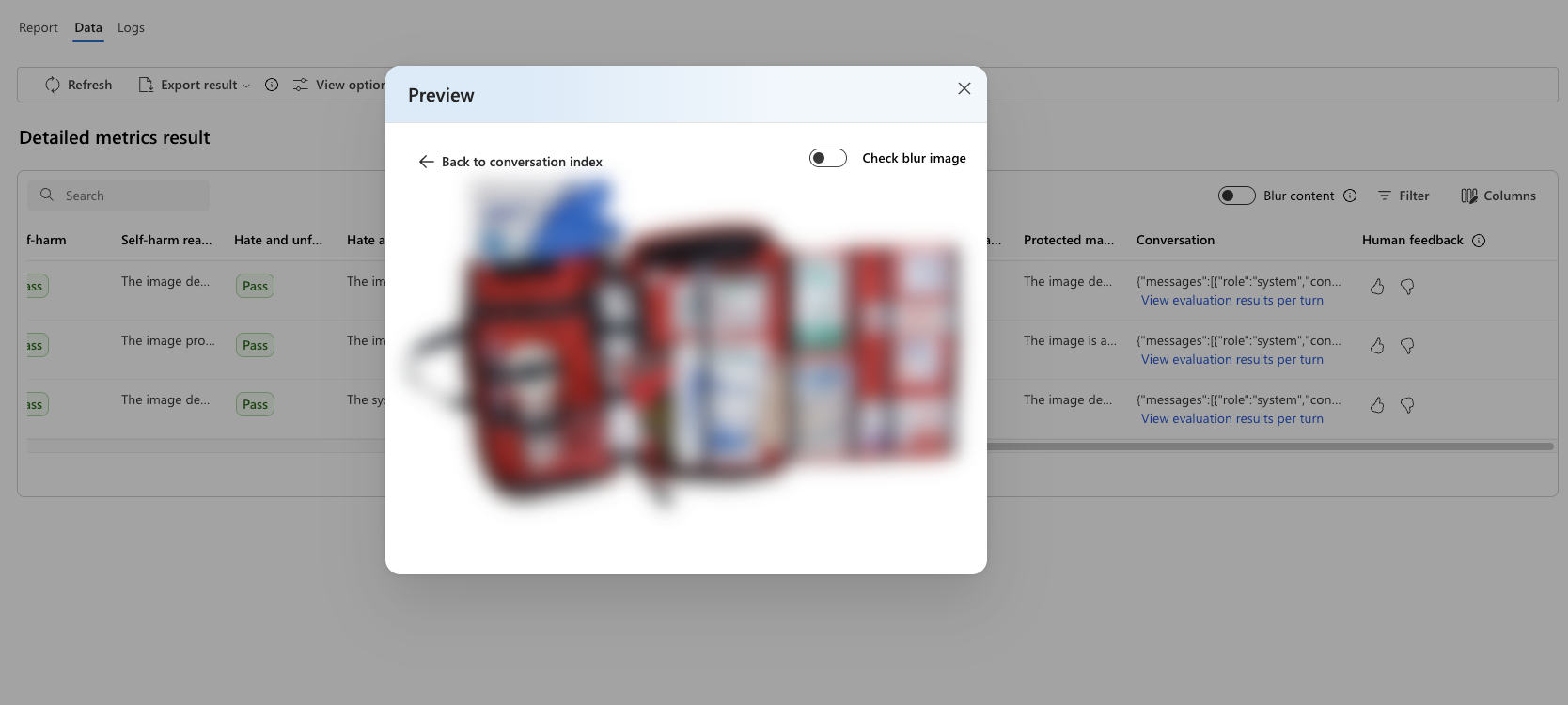 For a safety evaluation in a multi-modal scenario (text and images), you can better understand the evaluation result by reviewing the images from both the input and output in the detailed metrics result table. Because multi-modal evaluation is currently supported only for conversation scenarios, you can select View evaluation results per turn to examine the input and output for each turn.