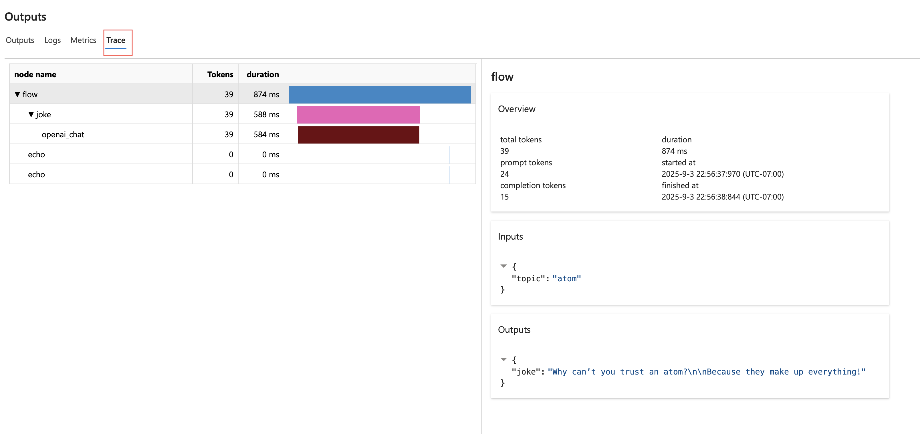 Select the Trace tab on the Outputs screen to see a graph that provides information about the duration and associated token cost of the flow. Select flow under node name to see detailed flow overview information in the right pane.