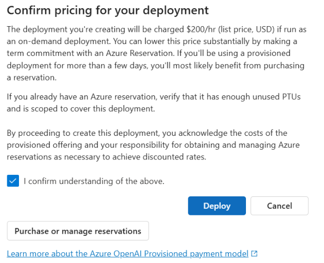 If you are unsure of the costs, cancel the deployment and proceed once you understand the payment model and underlying costs for provisioned deployment. This step may prevent unexpected, high charges on your payment invoice. Resources to educate yourself include: