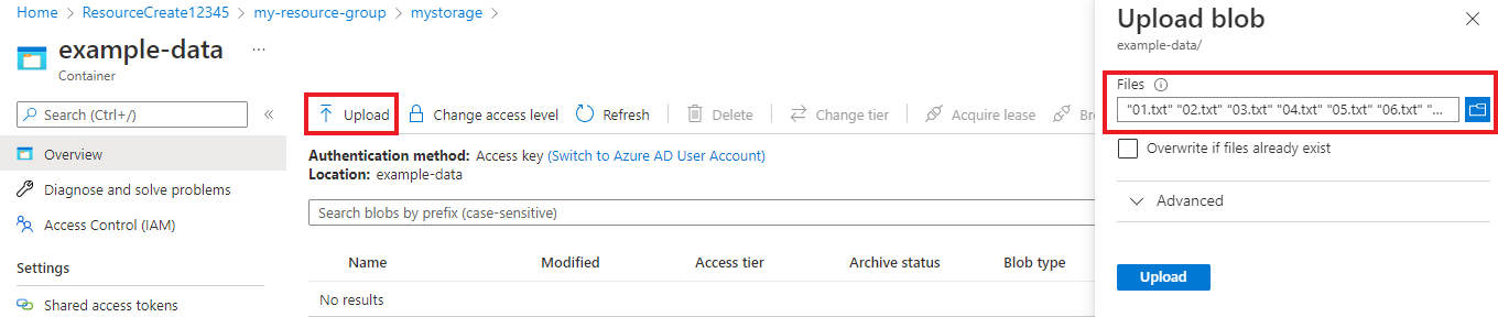 .txtand.jsonfiles you downloaded earlier. Finally, select the Upload button to add the file to your container.