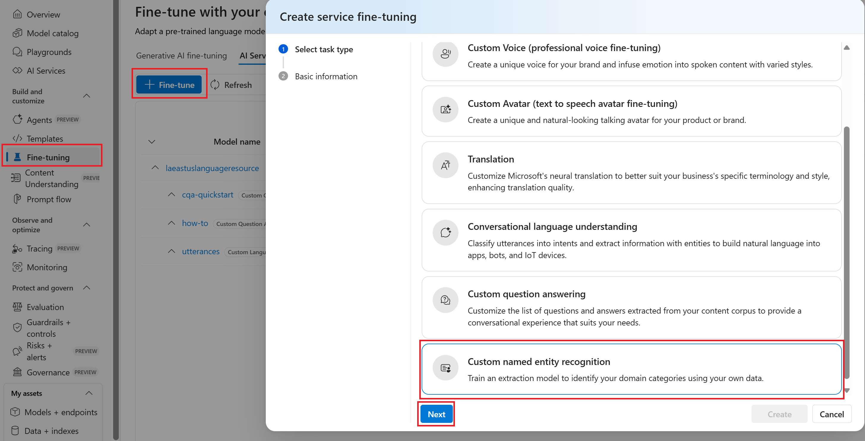 From the Create service fine-tuning window, choose the Custom named entity recognition tab, and then select Next.