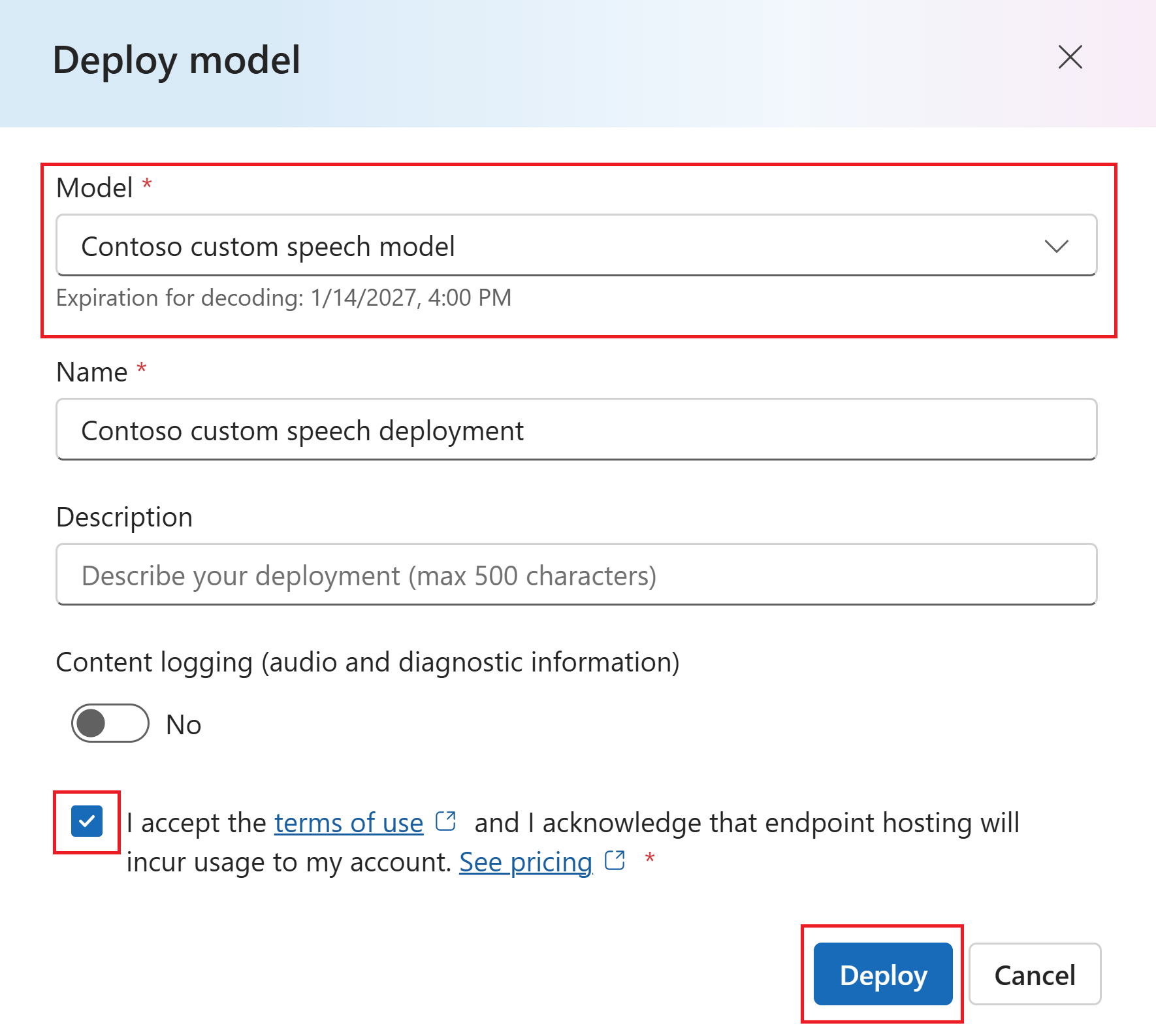 In this article, you learn how to deploy an endpoint for a custom speech model. Except for batch transcription, you must deploy a custom endpoint to use a custom speech model.
